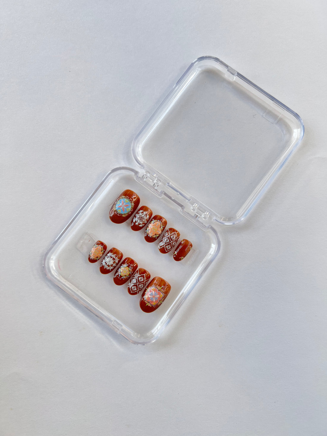Glossora Boho Floral Press-On Nails – Green & Teal Hand-Painted Art Set