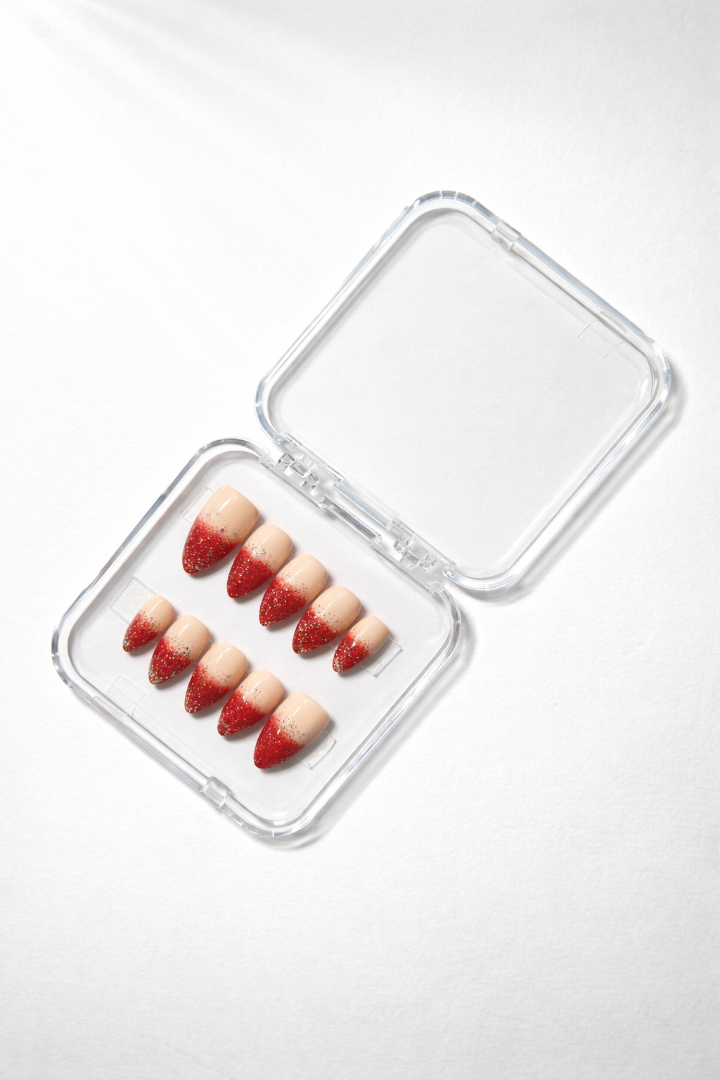 Ruby Fade Elegance features a soft nude base that melts into rich ruby-red tips, dusted...