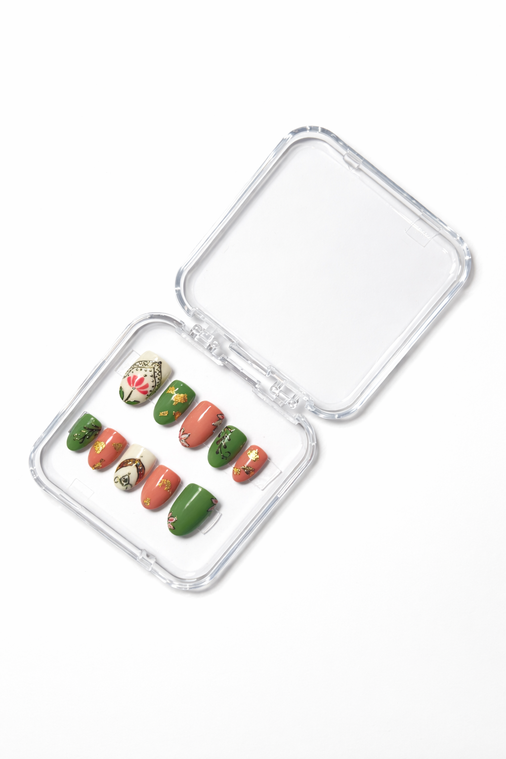 Hand-painted floral press-on nail set with green, peach & gold accents 🌿🌸✨