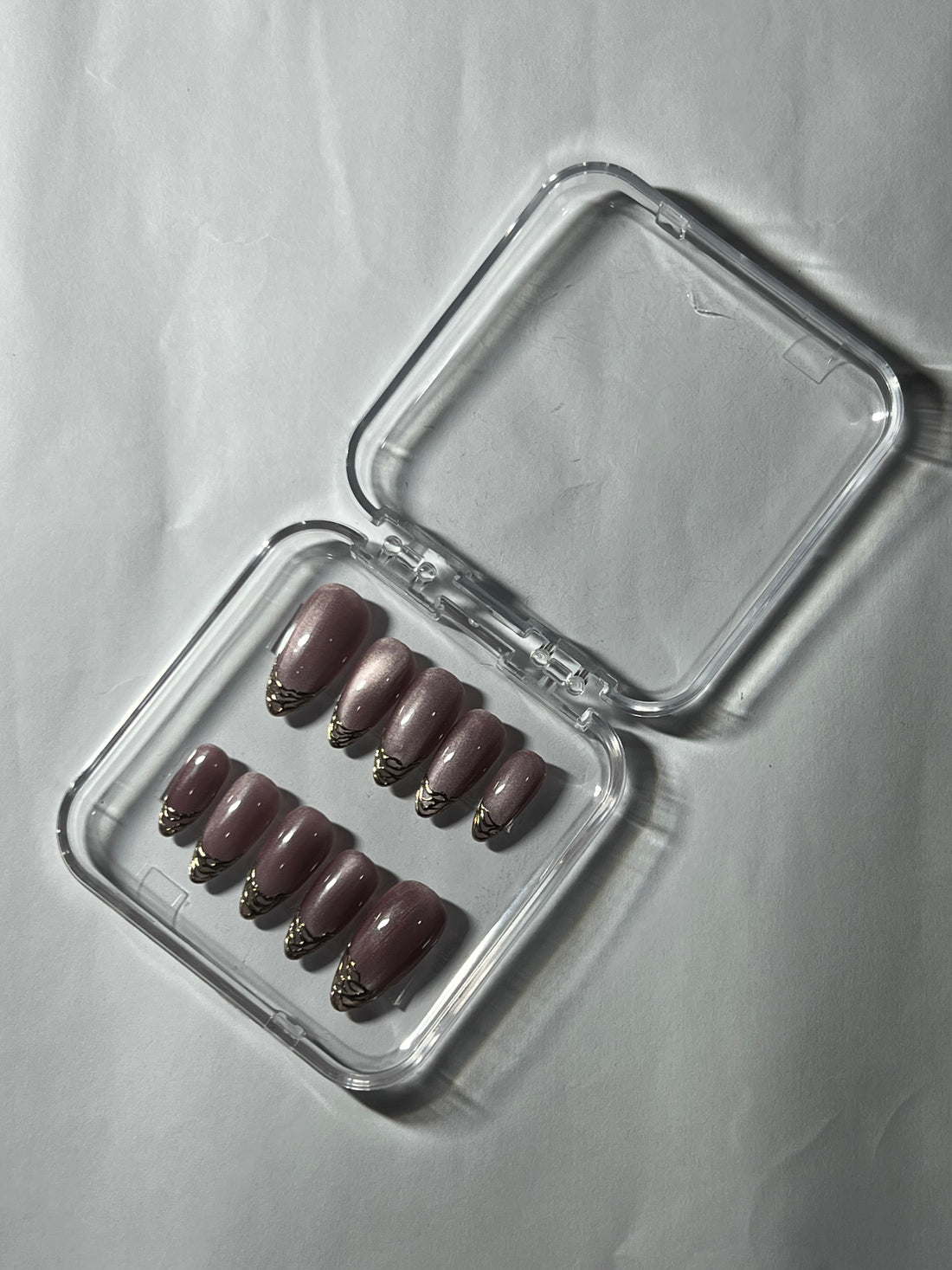 A soft, velvety mauve base paired with delicate golden carved tips makes this set the...