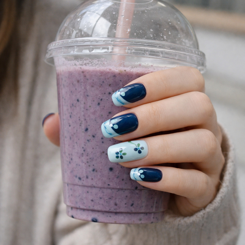 Bring a touch of charm to your fingertips with our Blue Blossom French press-on nails. Designed with a chic blend of navy blue and sky blue, this set features a modern French tip twist paired with delicate floral details. The soft petal accents add a playful yet elegant vibe, making these nails perfect for everyday wear or special outings.