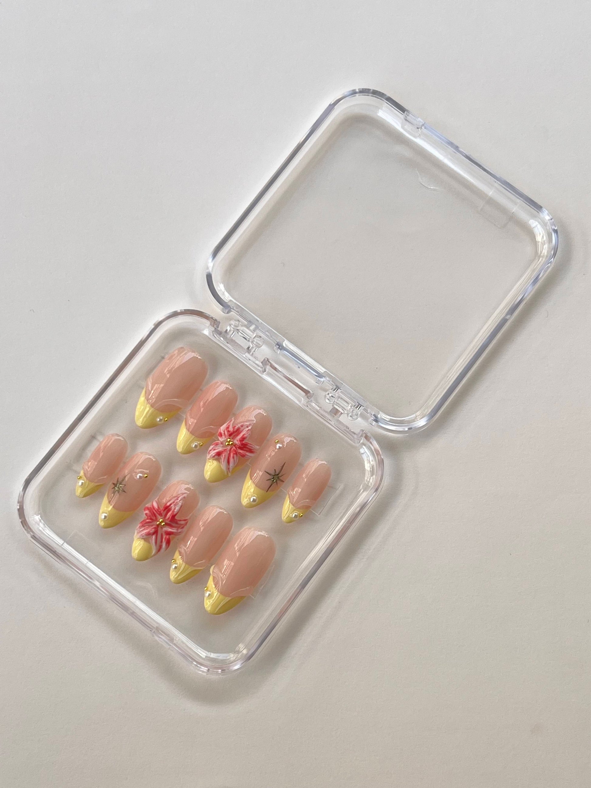 Add effortless charm to your nail look with this beautifully curated 3-style press-on nail combo set, designed to blend timeless elegance with fresh, joyful details. Featuring ivory florals, celestial French tips, and cheerful yellow accents, this collection is perfect for everyday sophistication and special moments alike.