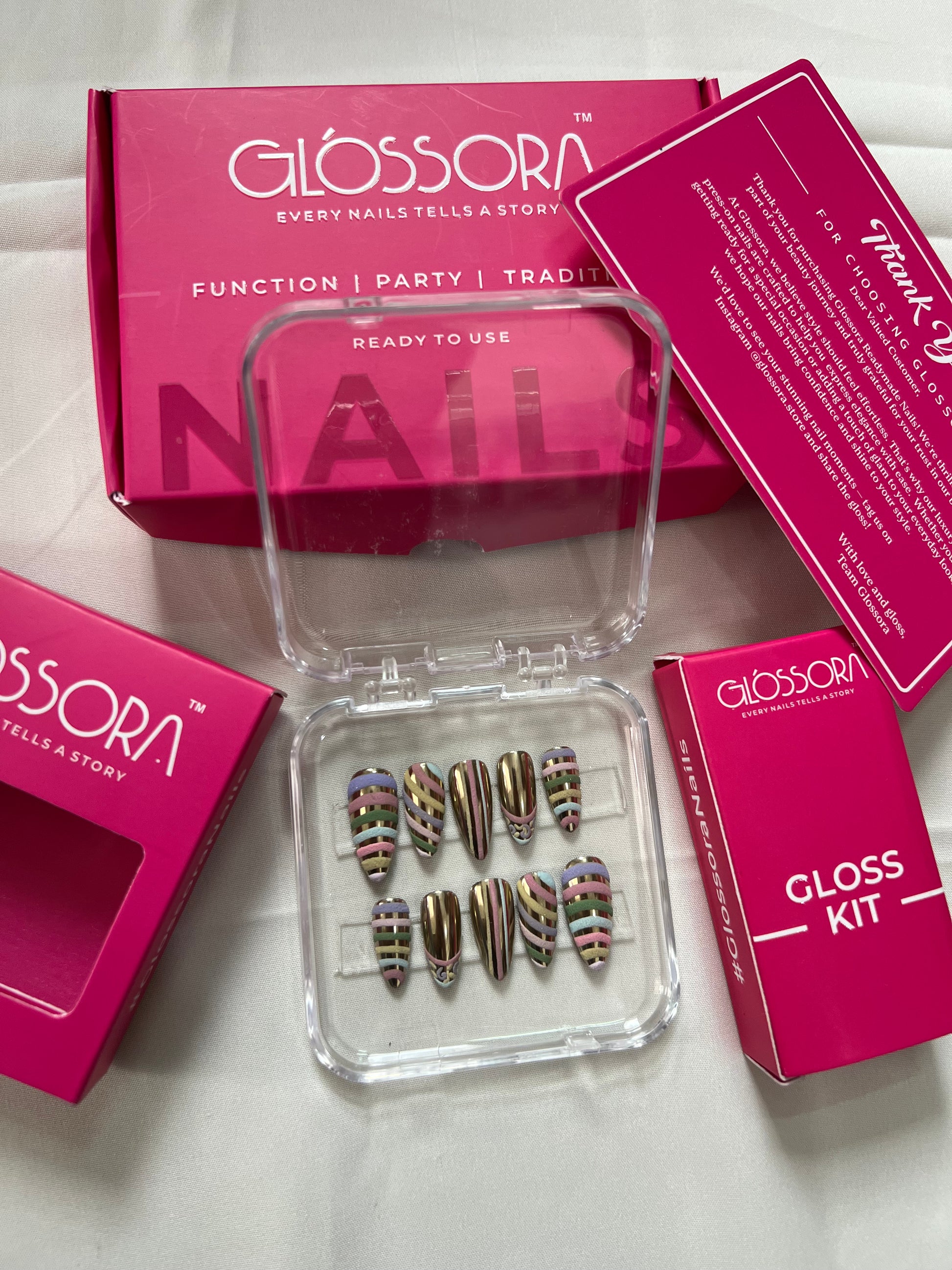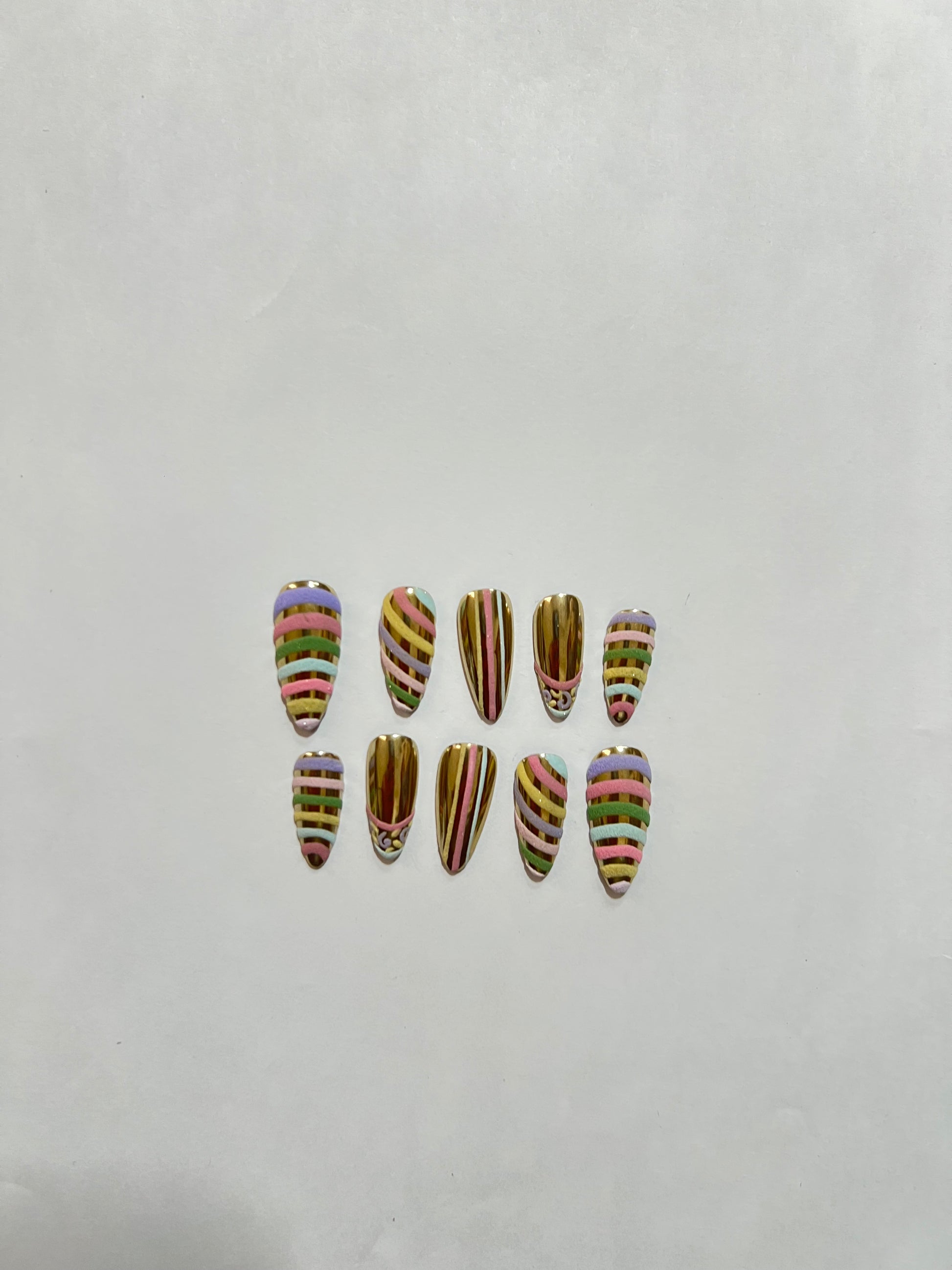 Add a playful touch of luxury to your look with our Golden Candy Swirl Nails! Featuring mesmerizing pastel stripes in lilac, mint, and peach with bold golden chrome accents, these nails blend elegance and fun in every curve. Perfect for festive vibes, parties, or anyone who loves a pop of color with a metallic twist.
