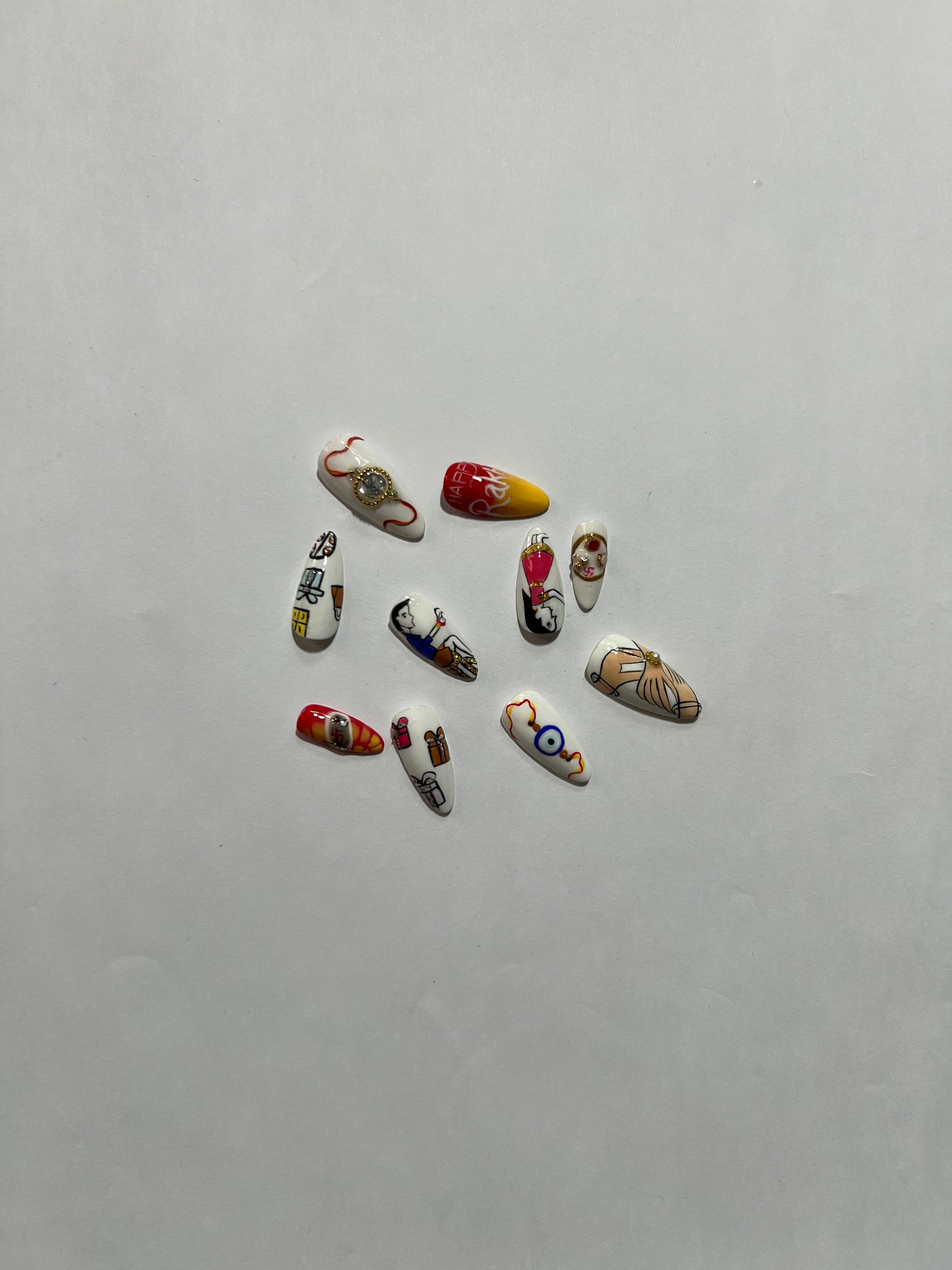 Celebrate the unbreakable bond of love with our Raksha Bandhan Special Nail Set. Designed to complement your festive look, these nails bring together soft elegance, traditional charm, and a touch of sparkle—perfect for your Rakhi outfit. Whether you’re dressing up in ethnic wear or going for Indo-western glam, this set adds the right amount of festivity and grace.