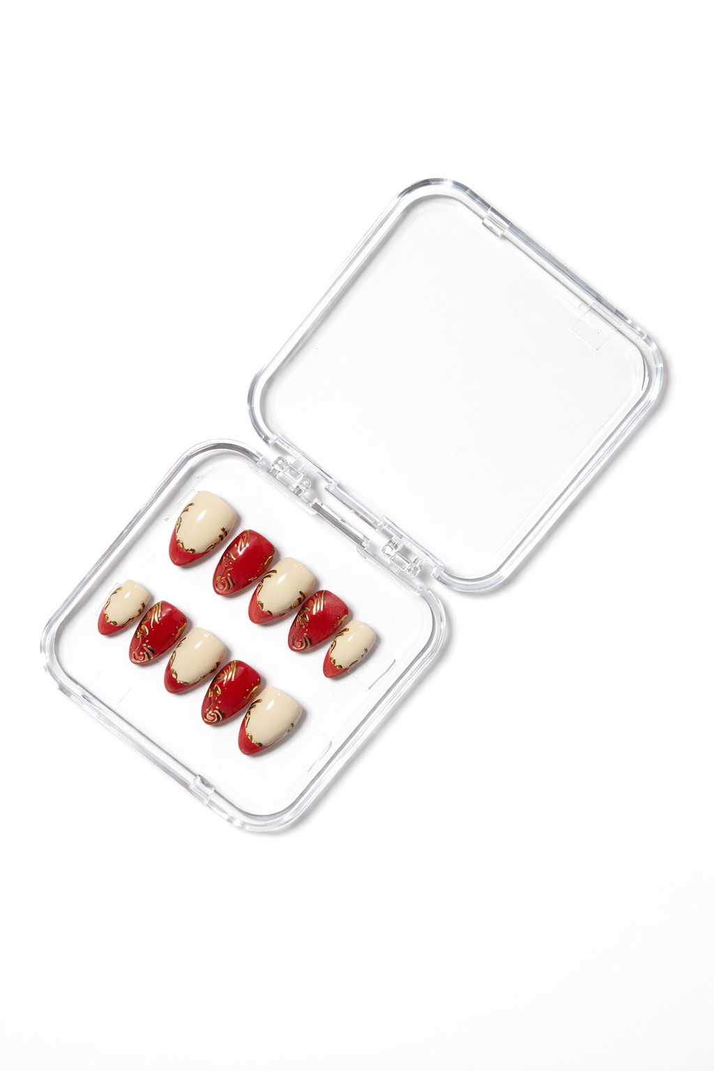 Red & ivory press-on nail set with gold swirl detailing ❤️✨