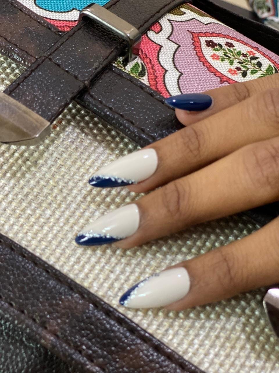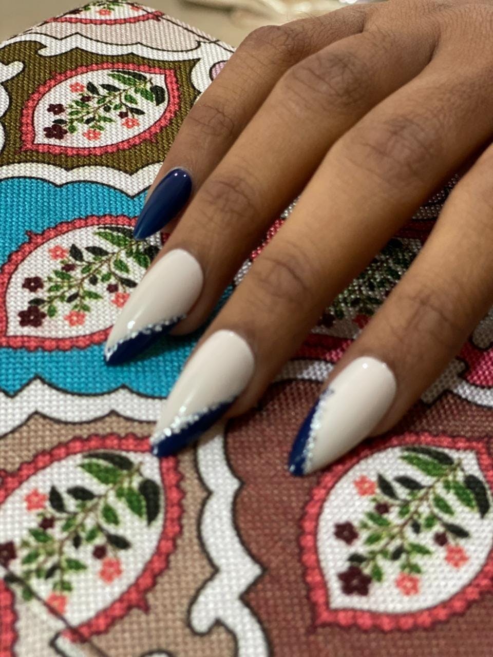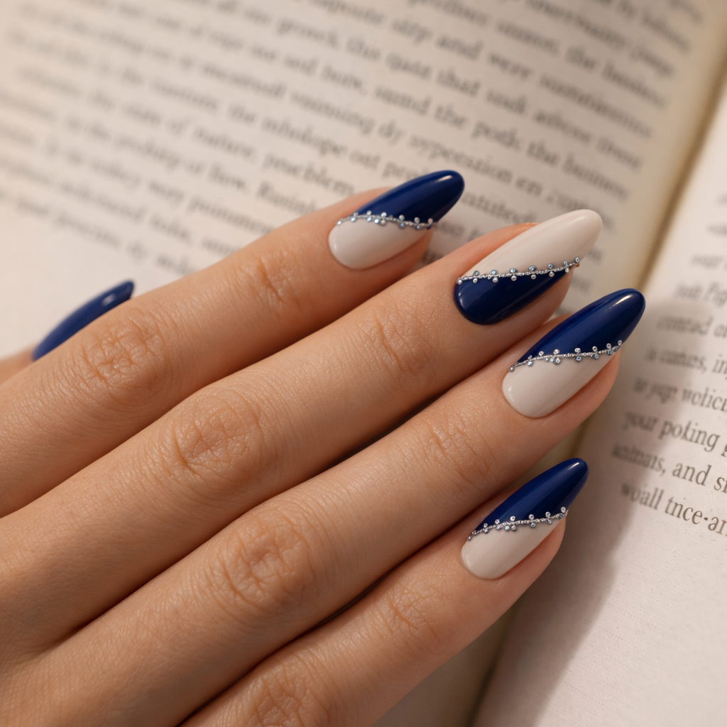 Elevate your style with Sapphire Elegance — a refined press-on nail set featuring a sophisticated combination of deep navy blue and crisp white. The design showcases a sleek diagonal split enhanced with silver glitter accents, creating a classy and modern contrast. Whether you're heading to a formal event or simply want to add a touch of grace to your everyday look, this set delivers timeless beauty with a touch of sparkle. Includes 10 reusable nails in various sizes for a perfect, salon-like fit.