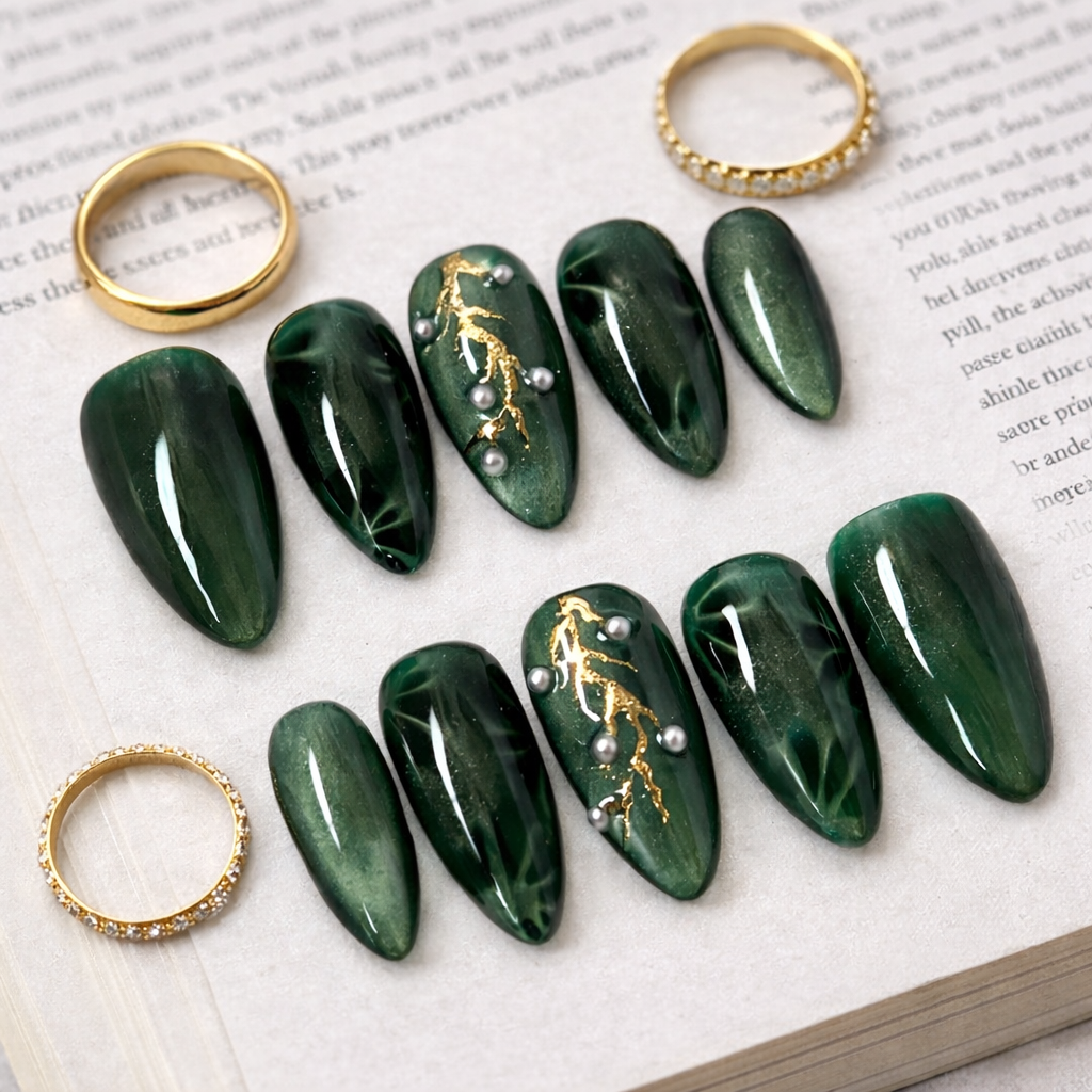 Smoky Mauve & Green Marble Press-On Nails – Subtle Glitter