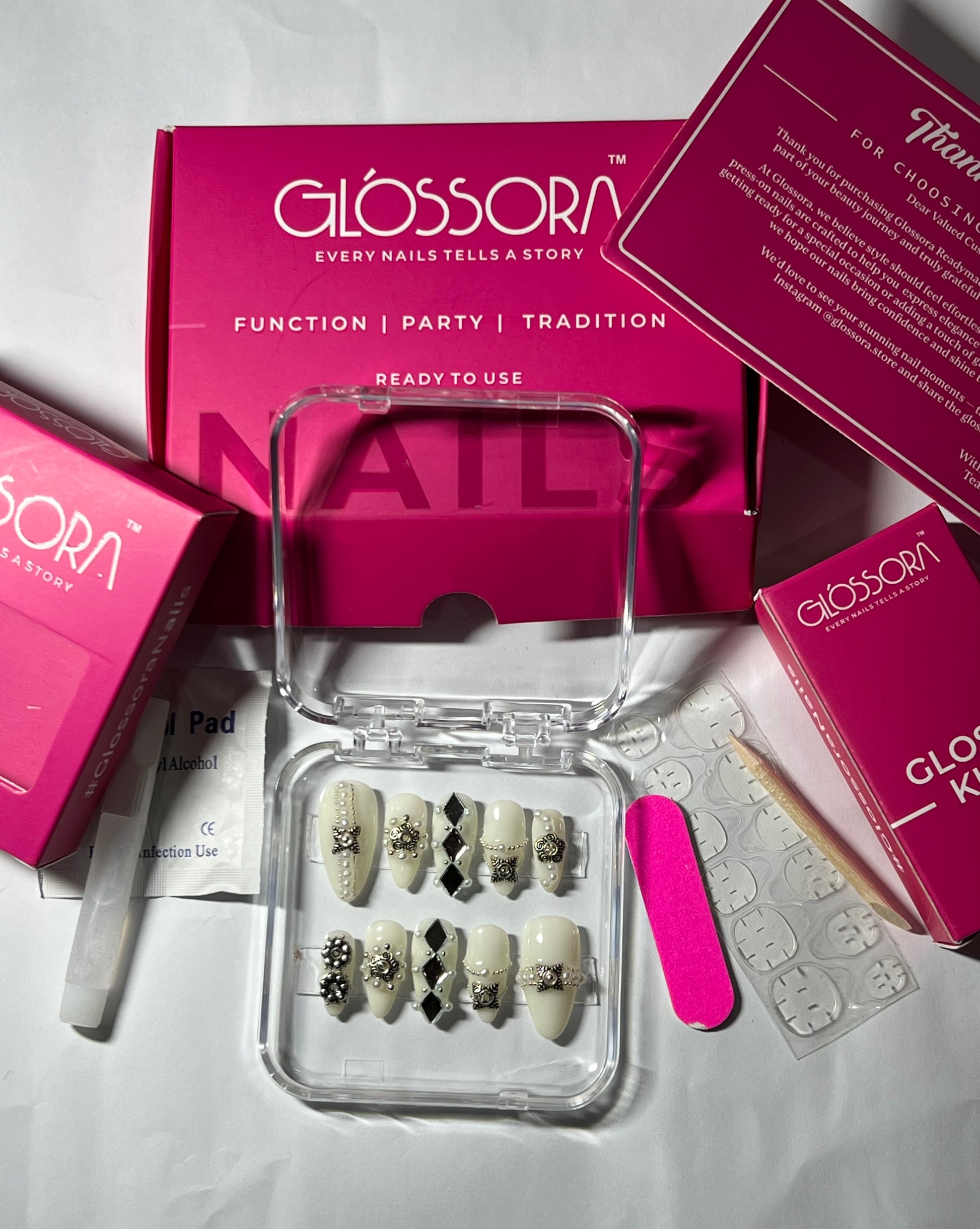 A luxurious blend of ivory tones and antique silver charms, this set features mirror-cut geometric accents, intricate metal studs, and soft pearl detailing. Designed for bold, classy, and statement-making looks—perfect for weddings, festive events, or anyone who loves royal-inspired nail art.